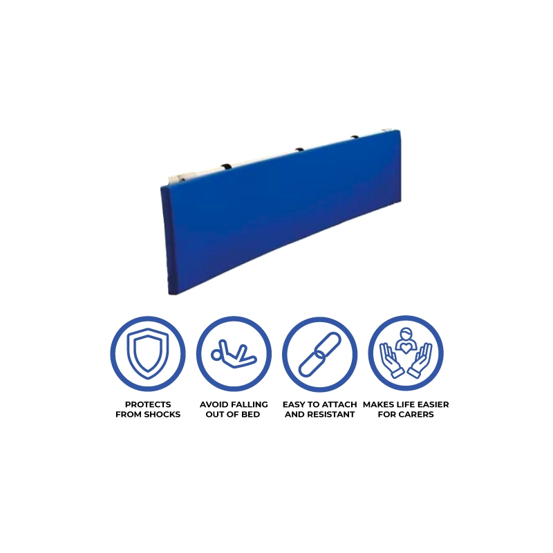 El cubre barandillas acolchado sirve para evitar que el paciente se golpee contra las barandillas de madera o metálicas de la cama y a su vez evita atrapamientos accidentales entre las barras de la misma. Para mayor seguridad del protector de barandillas, sitúa la parte acolchada por el interior de las barandillas cuando estas permanezcan subidas. Se debe pasar las cintas de sujeción rodeando las barandillas de la cama y enganchar los cierres de clip.