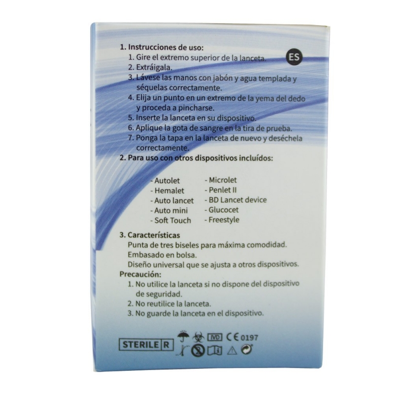 - Las lancetas son compatibles con los dispositivos: Autolet, Hemalet, Auto lancet, Auto mini, Soft Touch, Microlet, Penlet II, BD Lancett device, Glucocet, Freestyle.