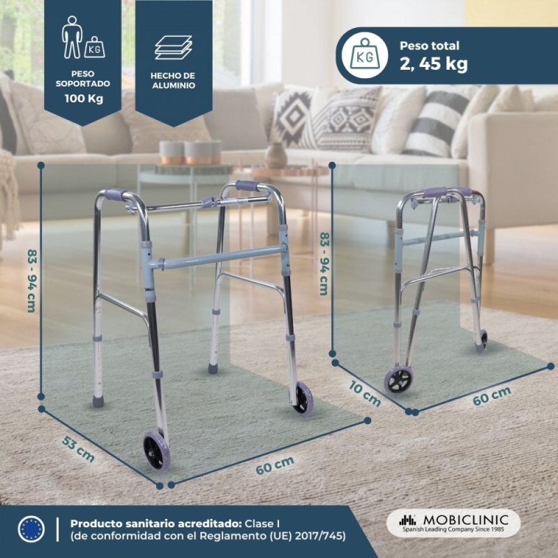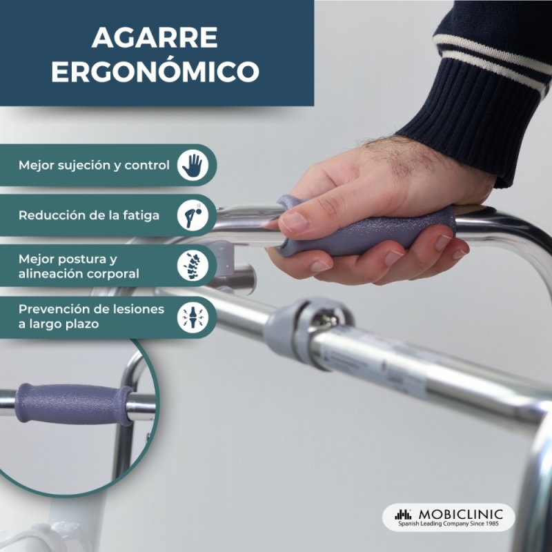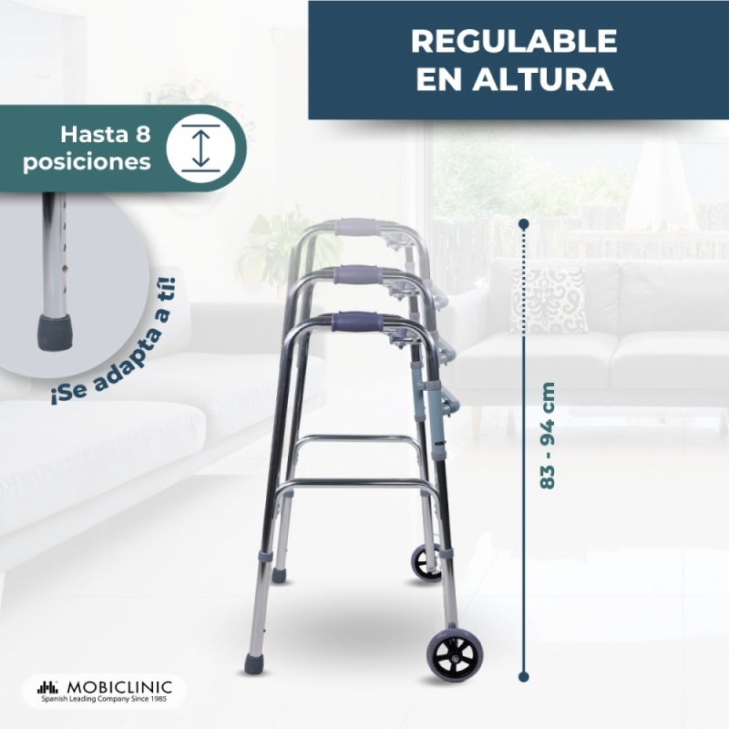 Es regulable en altura, por lo que es adaptable a las necesidades de cada usuario. Cuenta con puños ergonómicos que ofrecen comodidad y confort durante el uso. Y tiene un botón en el chasis que permite plegar el andador ortopédico cuando sea necesario, una vez plegado se podrá almacenar sin ocupar apenas espacio.