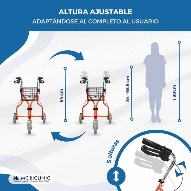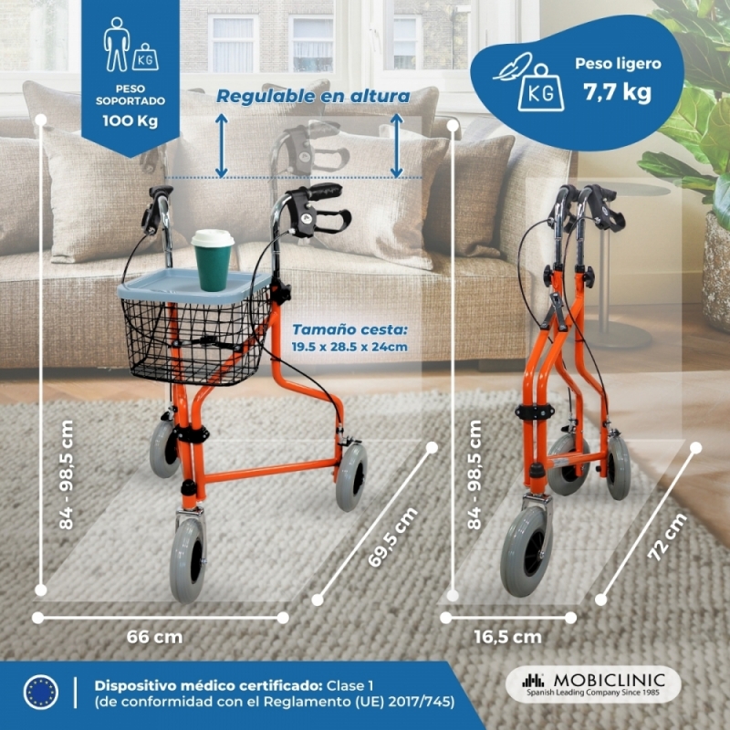 Podrá utilizarlo tanto en espacios de interior como de exterior gracias a sus tres ruedas y su estructura de acero ligero, que le permiten realizar movimientos sencillos y ligeros. La altura del andador plegable es regulable para adaptándose a las necesidades de cada usuario.