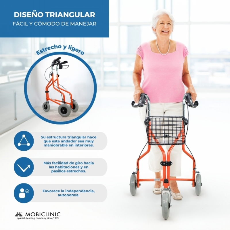 Este andador de adultos modelo Caleta plegable con tres ruedas, está indicado para personas con problemas de movilidad, en tratamiento o en proceso de rehabilitación, ya que les proporciona la estabilidad que necesitan durante sus desplazamientos o paseos.