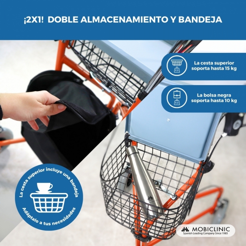 Su diseño en naranja es funcional y moderno, contiene un tablero y una gran cesta fija en la parte delantera y una bolsa en la trasera para poder transportar multitud de objetos sin ningún problema. Este andador ortopédico es plegable permitiendo poder transportarlo y almacenarlo muy fácil y cómodamente. Solo mide 16.5 cm de ancho cuando está plegado.