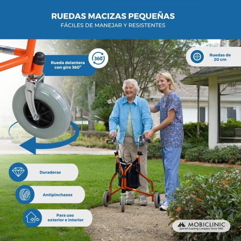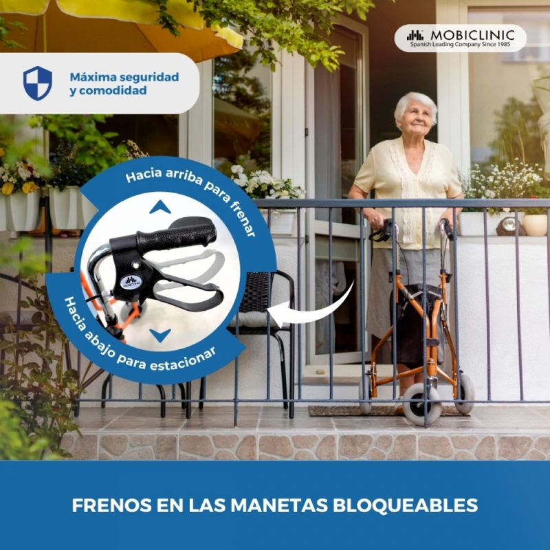 SU SEGURIDAD, LO MÁS IMPORTANTE: sus tres ruedas macizas y sus frenos en las empuñaduras hacen que este andador para personas mayores sea muy seguro para el usuario