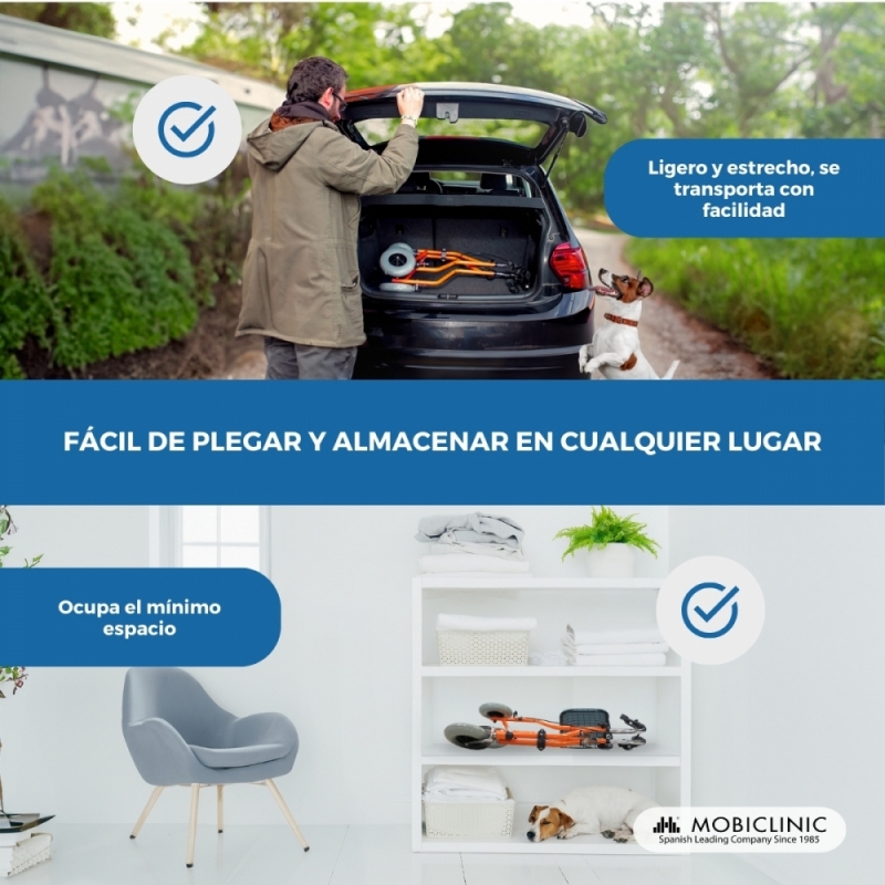 PLEGABLE: no tendrá que preocuparse a la hora de transportar y guardar este andador con ruedas, ya que se pliega muy fácilmente y ocupa el mínimo espacio (16.5 cm de ancho plegado)