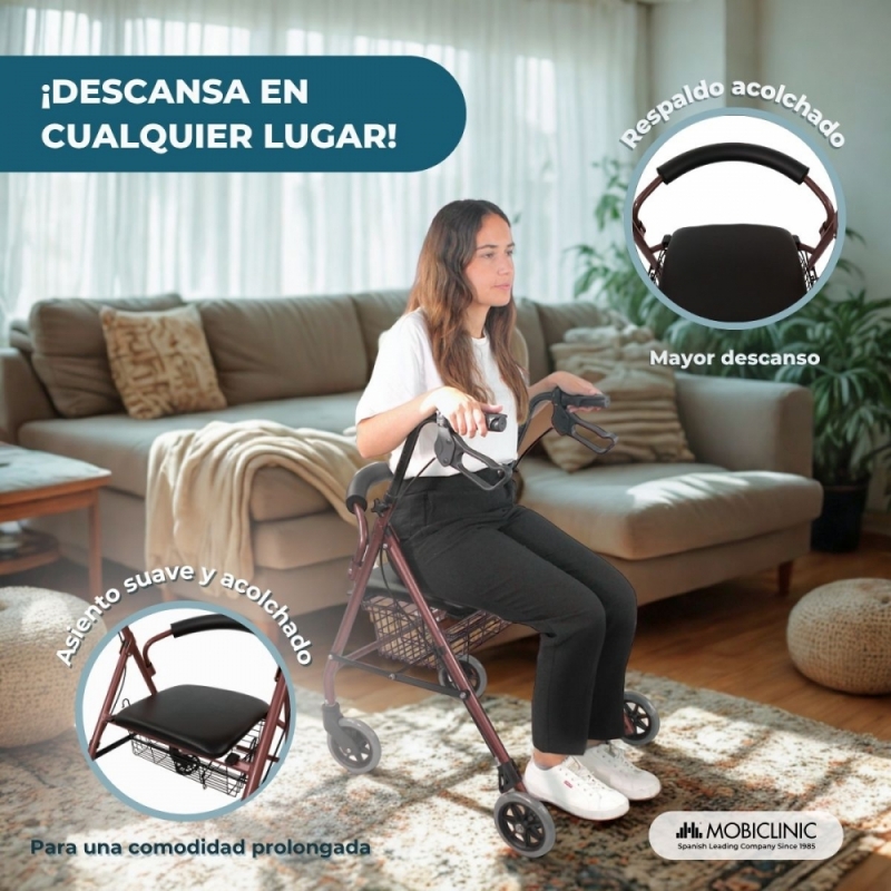 Este andador aluminio cuenta con un asiento y un respaldo acolchado para garantizar el confort y la seguridad, así como un descanso adecuado después del esfuerzo. Incluye una cesta pensada para guardar las pertenencias de manera segura y cómoda mientras caminas. Puedes posicionarla tanto debajo del asiento como en la parte delantera del andador.