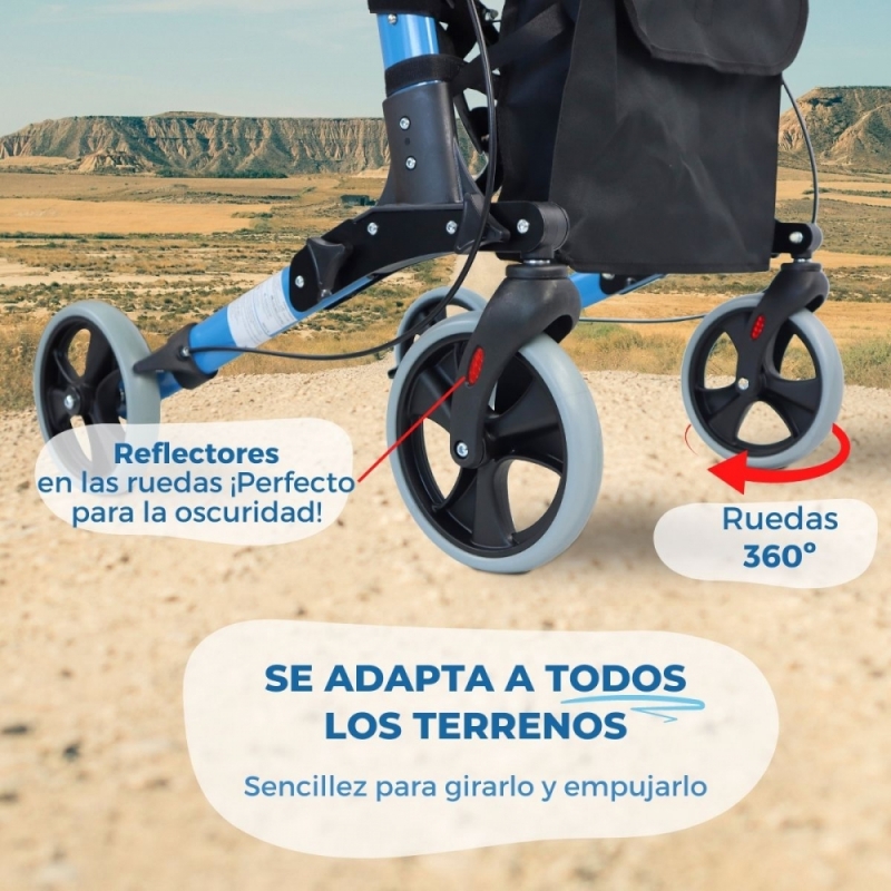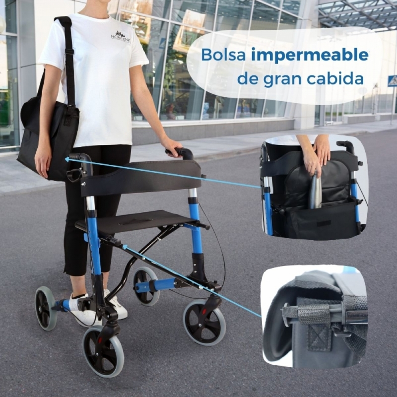 Este andador de 4 ruedas te proporcionará la máxima comodidad ya que incluye un asiento con respaldo, para que puedas descansar siempre que lo necesites. También contiene una bolsa de la compra, para que puedas hacer cualquier tipo de recado sin preocuparte por cargar los objetos. Además, dispone de un portamaletas para que puedas llevarlas contigo y con tu andador de aluminio a donde quiera que vayas.
