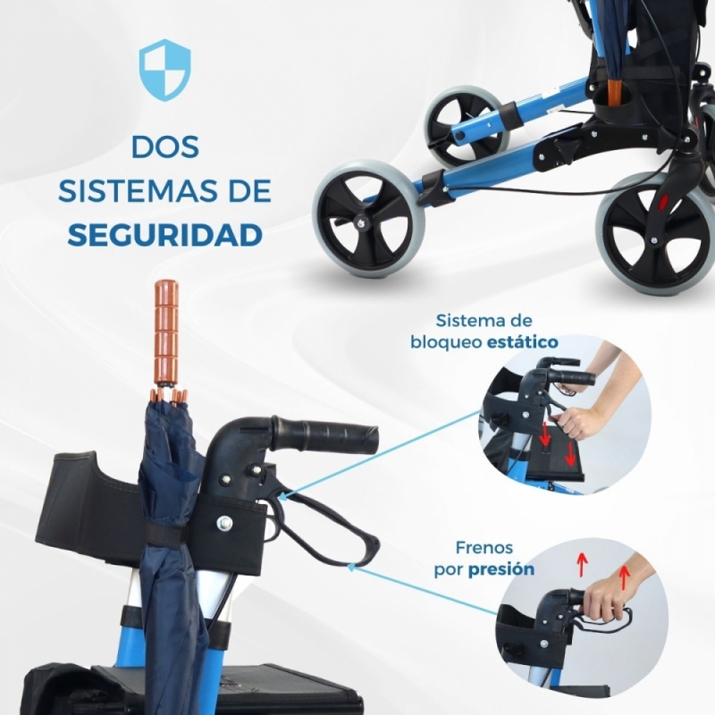 BLOQUEO: Si se necesita inmovilizar por completo el andador, hay que tirar de las manetas de los frenos hacia abajo y las ruedas quedarán bloqueadas. Para desbloquear hay que tirar de las manetas hacia arriba.