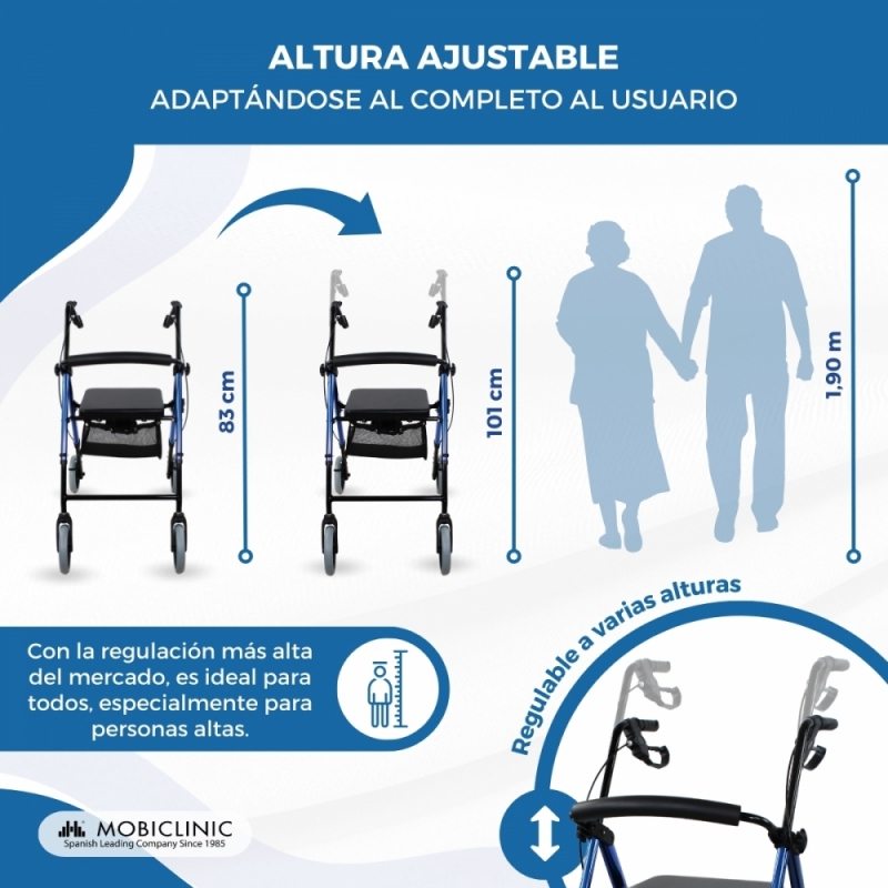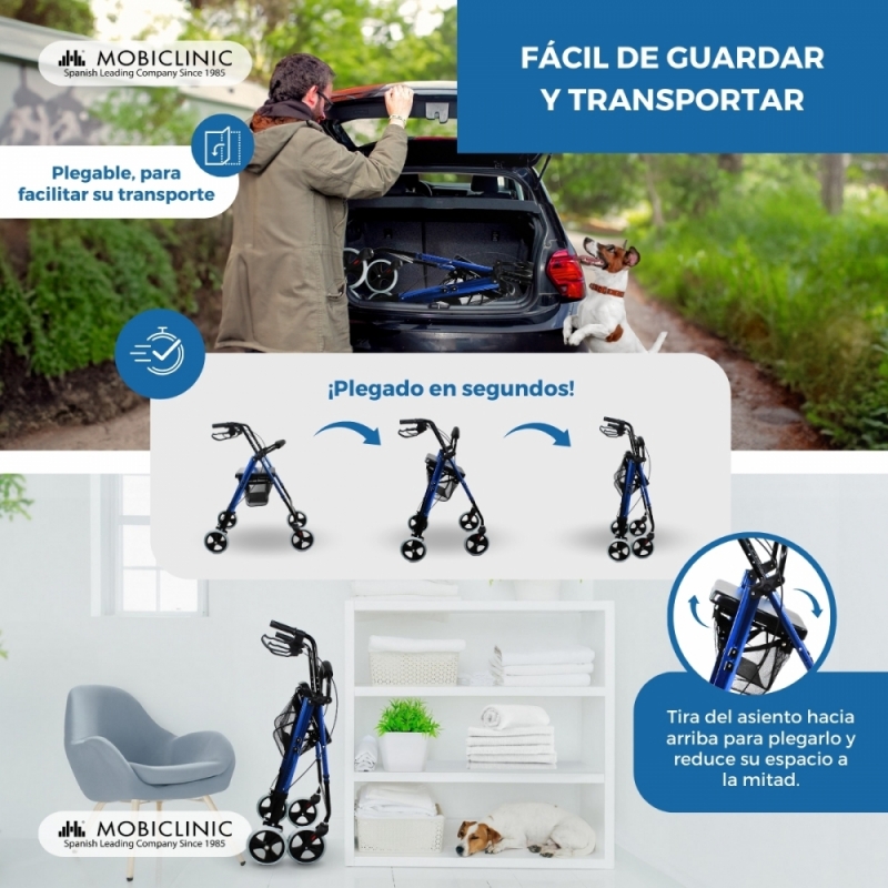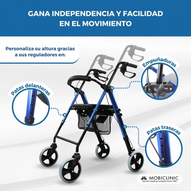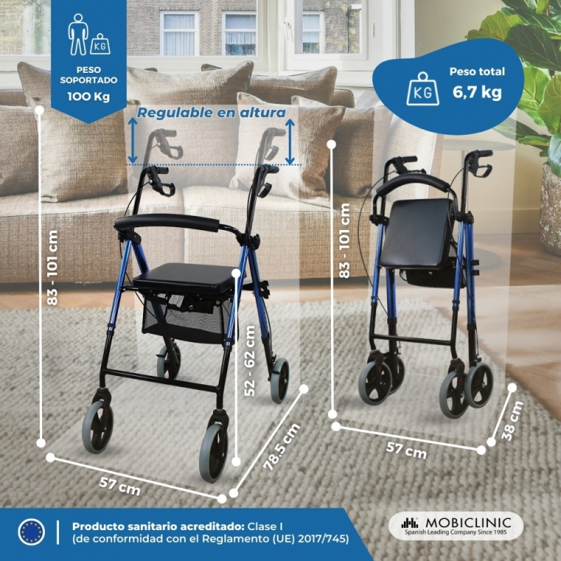 REGULABLE Y PLEGABLE: este andador de 4 ruedas permite regular su altura para adaptarlo a las necesidades del usuario (de 83- 101 cm). Además, podrás plegarlo fácilmente para transportarlo en cualquier maletero o guardarlo sin ocupar demasiado espacio