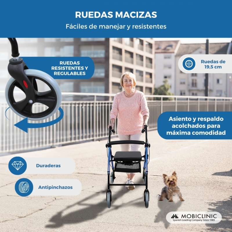 Con este andador de ancianos modelo Hércules podrás desplazarte tanto por tu casa como por la calle gracias a sus cuatro resistentes ruedas de 19,5 cm de diámetro, que tienen bandas reflectantes para mejorar la visibilidad y seguridad por la noche.