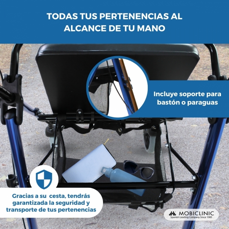 CÓMODO: el asiento y el respaldo acolchado de este andador ortopédico es ideal para descansar cómodamente y su bolsa de tela para guardar y transportar objetos facilitarán tus desplazamientos
