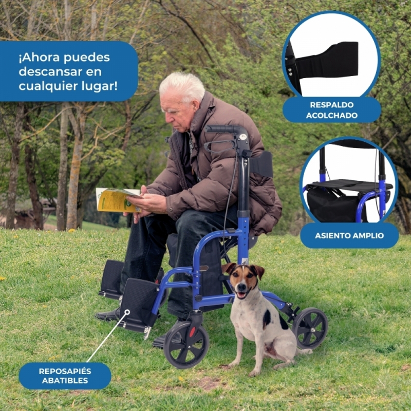 2 PRODUCTOS EN 1: No es solo un andador de adultos ya que sus prestaciones le hacen servir de apoyo como bastón y asiento. Cuenta con un cómodo asiento con respaldo y reposapiés para descansar. Dispone de una práctica cesta de compra y de porta bastón.
