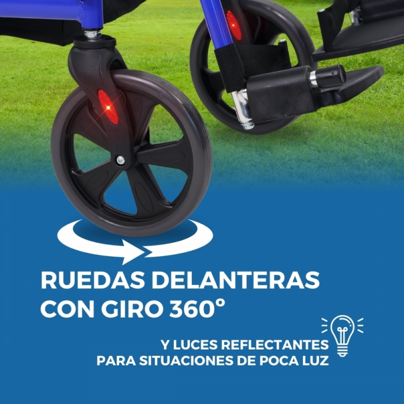 Con las 4 ruedas macizas de este andador con asiento no hay por qué preocuparse de pinchazos inoportunos, pues están diseñadas para superar cómodamente los pequeños obstáculos del firme, tanto en interiores como exteriores.