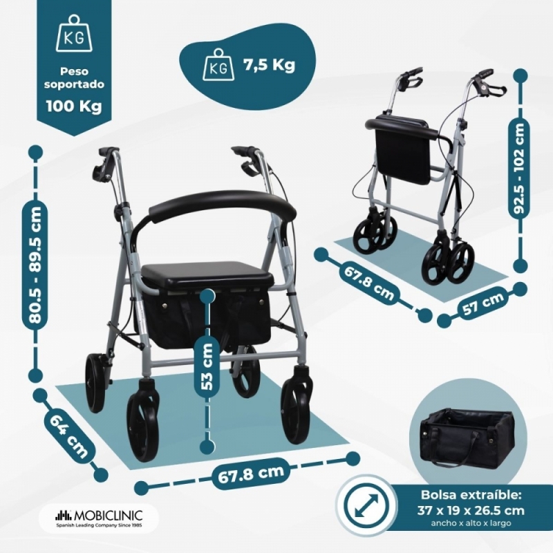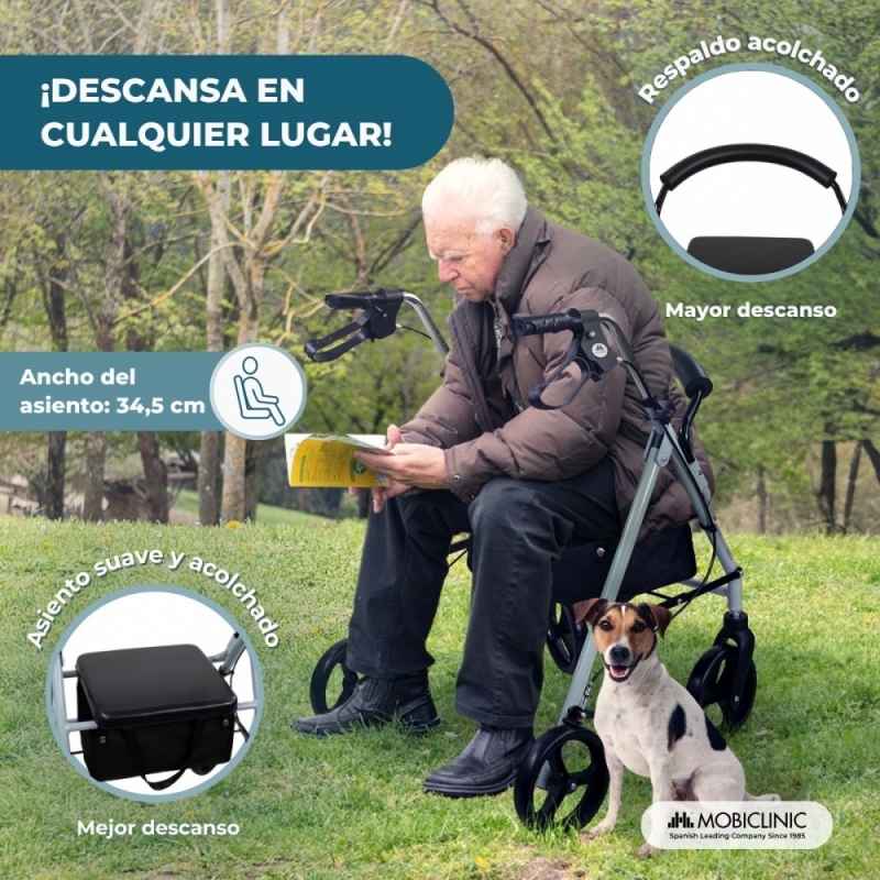2 PRODUCTOS EN 1: además de ser un andador para adultos, también ofrece la posibilidad de descanso tras un largo paseo al contar con un asiento y un respaldo acolchados.