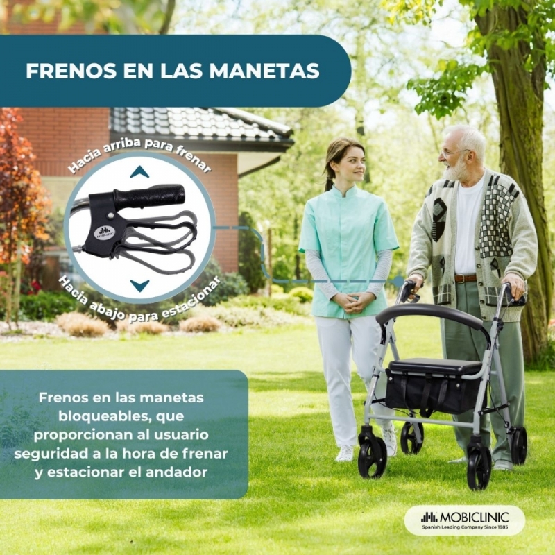 BLOQUEO: Si se necesita inmovilizar por completo el andador, hay que tirar de las manetas de los frenos hacia abajo y las ruedas quedarán bloqueadas. Para desbloquear hay que tirar de las manetas hacia arriba.