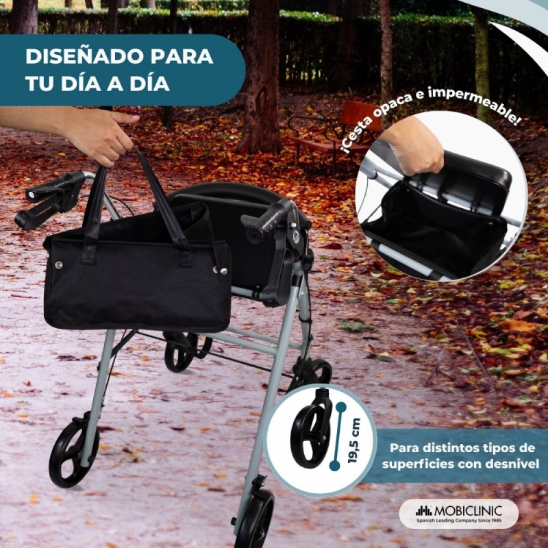 CÓMODO: contiene una cesta de gran capacidad bajo el asiento, el andador para personas mayores Sofía es perfecto para transportar los objetos rutinarios o para llevar las pequeñas compras diarias gracias a su cesta de tela, que aporta a su vez una mayor privacidad.