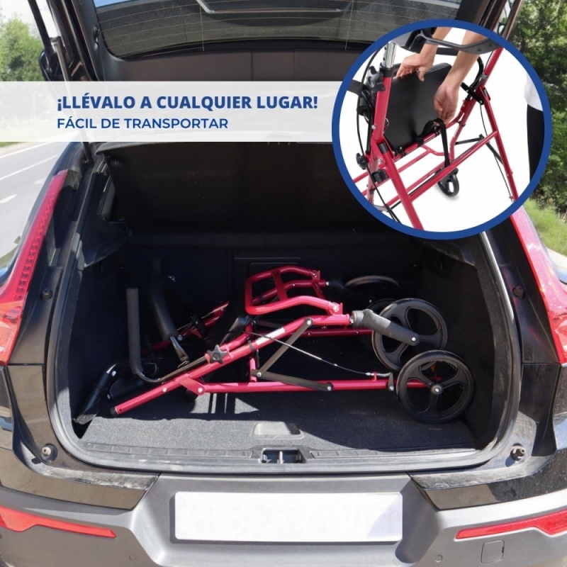 Por último, este andador con asiento tiene la capacidad de plegarse, y gracias a su material ligero, lo hace fácil de transportar.