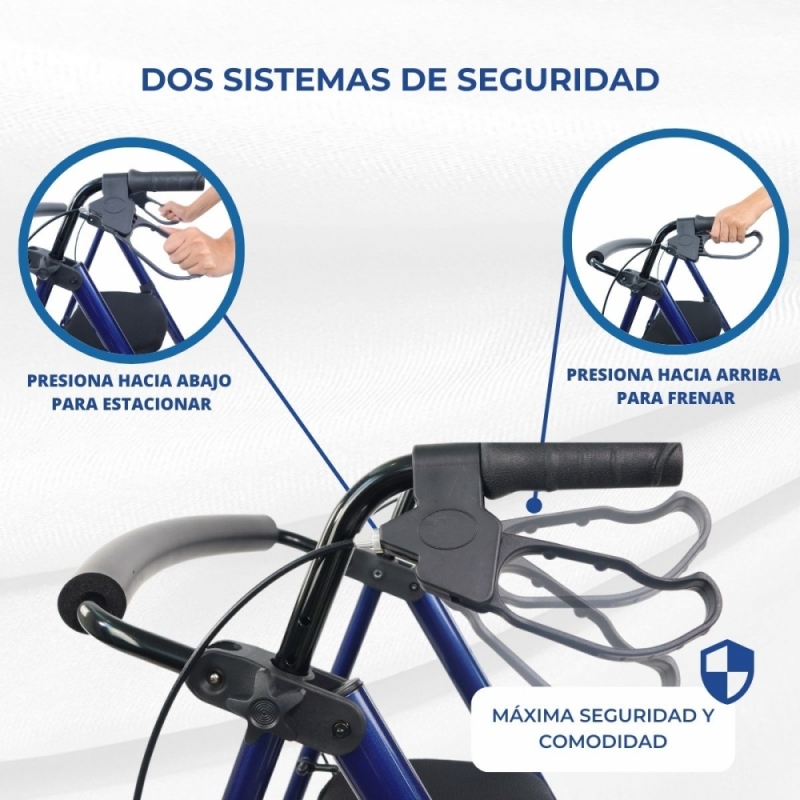 DE FÁCIL BLOQUEO: Si se necesita inmovilizar por completo el andador, hay que tirar de las manetas de los frenos hacia abajo y las ruedas quedarán bloqueadas. Para desbloquear, simplemente hay que tirar de las manetas hacia arriba.