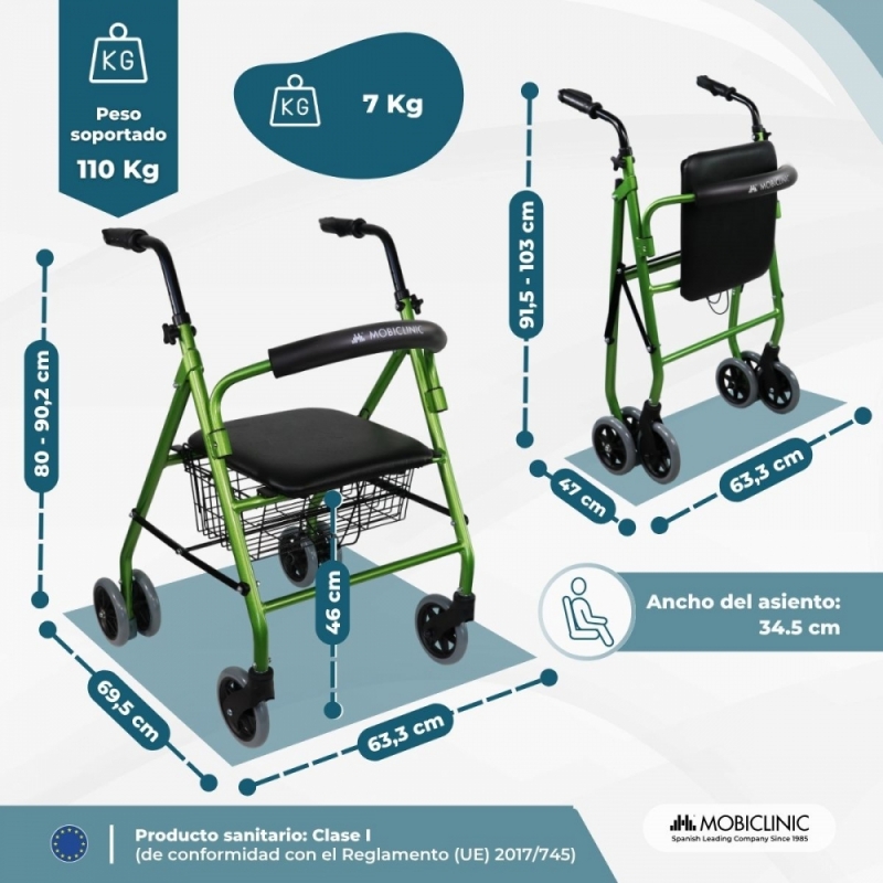 LIGERO: este andador de aluminio es de un material ligero y de gran calidad. Pesa 6,86 Kg, soportando un peso máximo de 110 Kg.