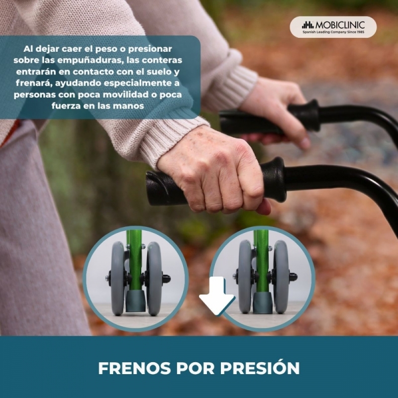 SEGURO: este andador para adultos dispone de frenos por presión, que se accionan fácilmente al ejercer fuerza sobre las empuñaduras del andador con ruedas. Este modelo ayuda a prevenir las caídas dándole al usuario una gran seguridad para que pueda desplazarse con tranquilidad y ganando autonomía e independencia.