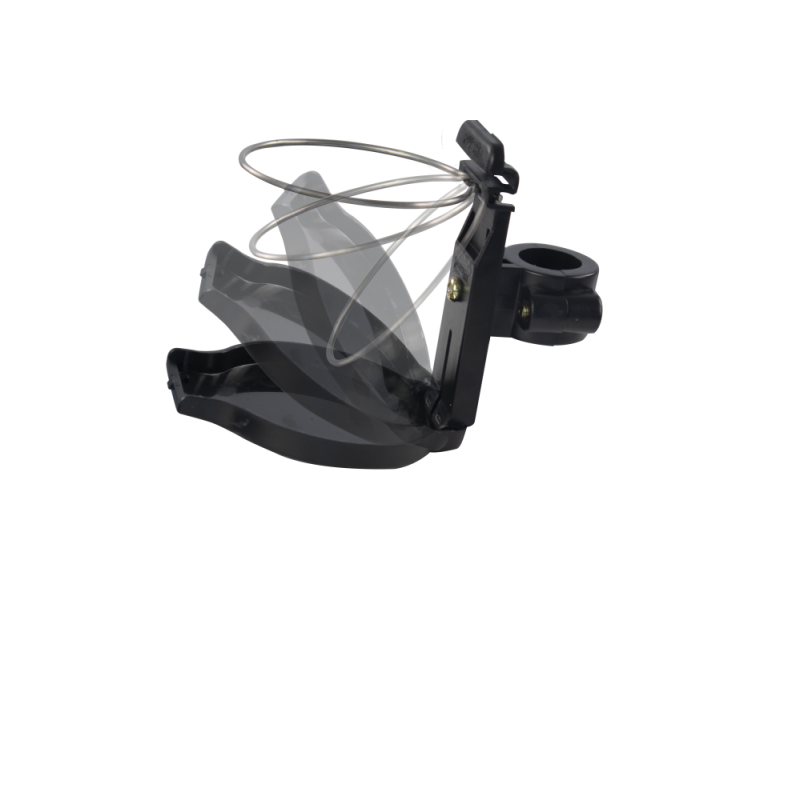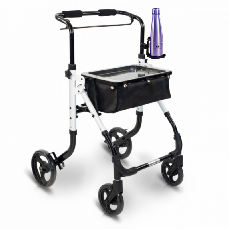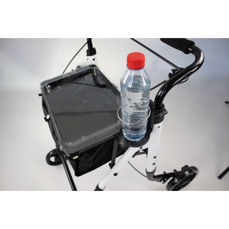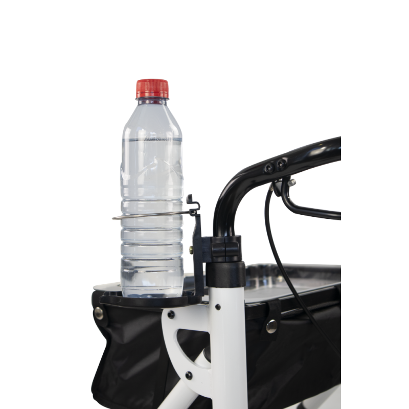 - Soporte para botellas o vasos: esta herramienta permite transportar toda clase de bebidas con seguridad gracias a su sencilla instalación. Para generar una mayor estabilidad, cuenta con una bandeja en su parte inferior y un anillo de sujeción en la parte superior. Está diseñado para sostener de forma firme y segura cualquier tipo de taza o botella, adaptándose fácilmente a la estructura del andador y con posibilidad de plegarse cuando no está en uso.