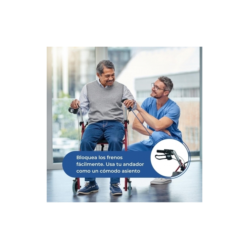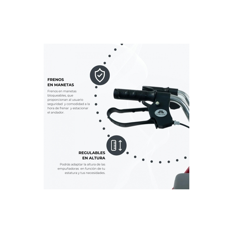 MÁS SEGURO: sus frenos, similares a los de una bicicleta, le permitirán frenar al andador con ruedas y asiento en cualquier momento. Si se necesita inmovilizar por completo el andador, hay que tirar de las manetas de los frenos hacia abajo y las ruedas quedarán bloqueadas. Para desbloquear hay que tirar de las manetas hacia arriba.