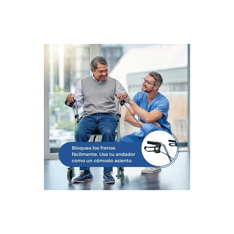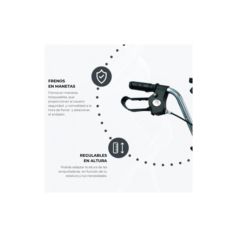 MÁS SEGURO: sus frenos, similares a los de una bicicleta, le permitirán frenar al andador con ruedas y asiento en cualquier momento. Si se necesita inmovilizar por completo el andador, hay que tirar de las manetas de los frenos hacia abajo y las ruedas quedarán bloqueadas. Para desbloquear hay que tirar de las manetas hacia arriba.