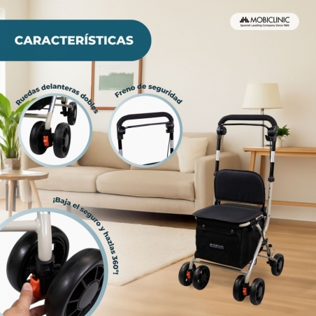 Carro de la compra andador | 4 ruedas | Hasta 120 Kg | Plegable | Con bolsa | Sistema de frenado | Negro | Coliseo | Mobiclinic