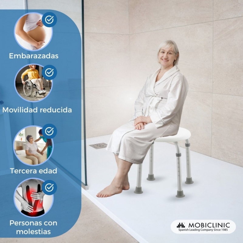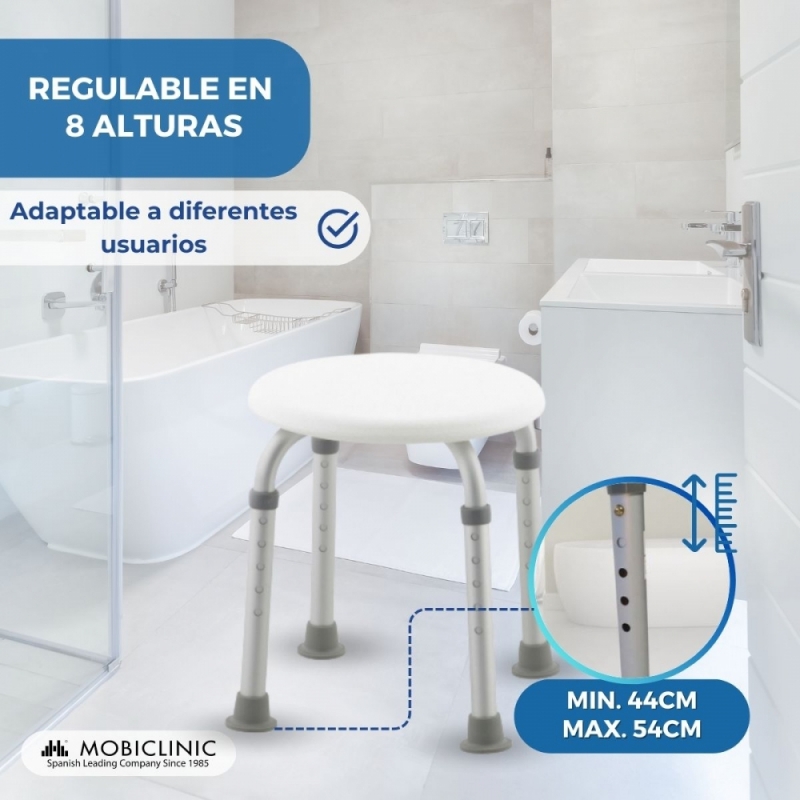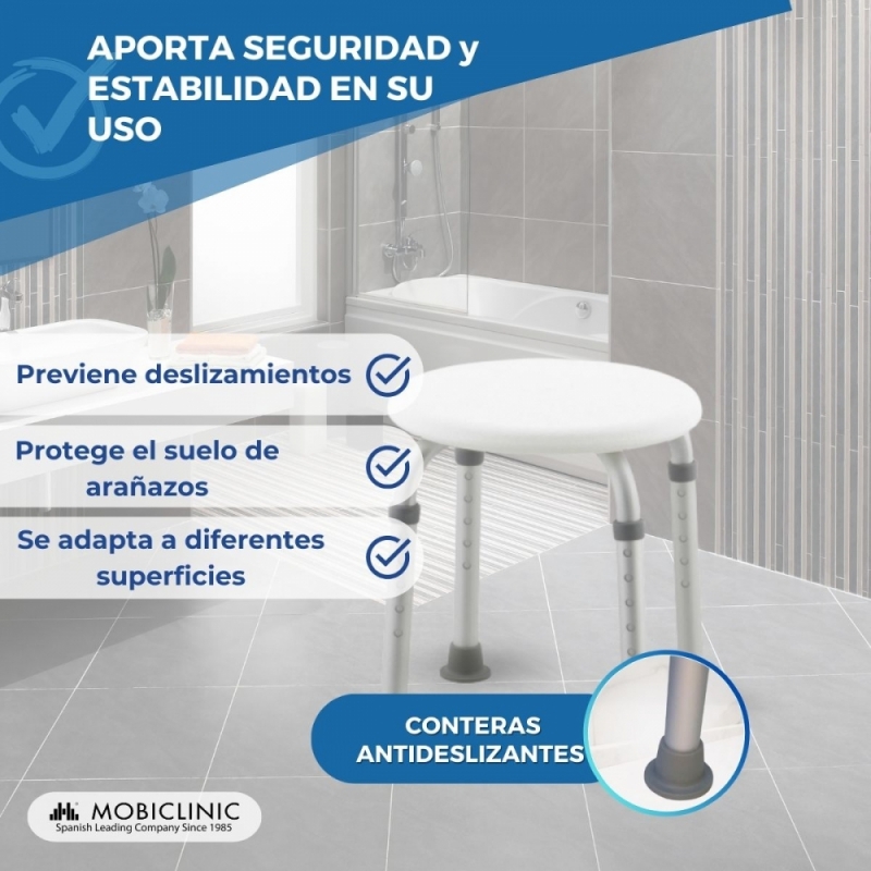Es regulable en altura en 10 cm de forma independiente cada pata. Las patas tienen conteras con ventosas de alta adherencia para proporcionar mayor estabilidad Su uso está recomendado para personas mayores, ancianos, personas con movilidad reducida o que tienen alguna dificultad para permanecer de pie mucho tiempo.