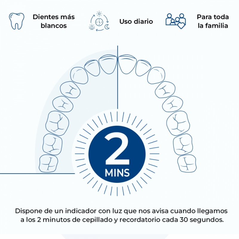 Dispone de un indicador con luz que nos avisa cuando llegamos a los 2 minutos de cepillado y recordatorio cada 30 segundos. Tiene una velocidad de rotación de 8.000 veces/minuto y es impermeable, lo que evita riesgos innecesarios en el baño.