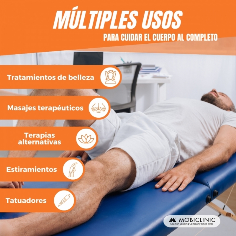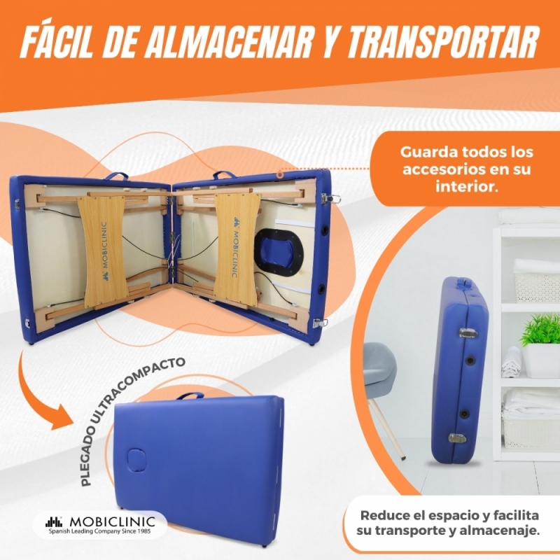 Es plegable, lo que permite que pueda ser usado también por personas que la utilizan a domicilio. Para mayor comodidad al ser transportada, esta cuenta con una elegante bolsa de transporte con asa para poder echarla al hombro. Además, para abrir y plegar cuenta con un sistema de bloque automático.