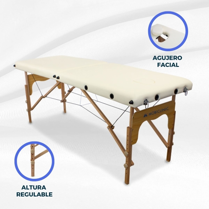 Camilla de madera plegable perfecta para transmitir calidez y relajación al cliente. Este modelo está tapizado en polipiel de alta resistencia, siendo realmente cómoda para el usuario que se tumbe en ella.