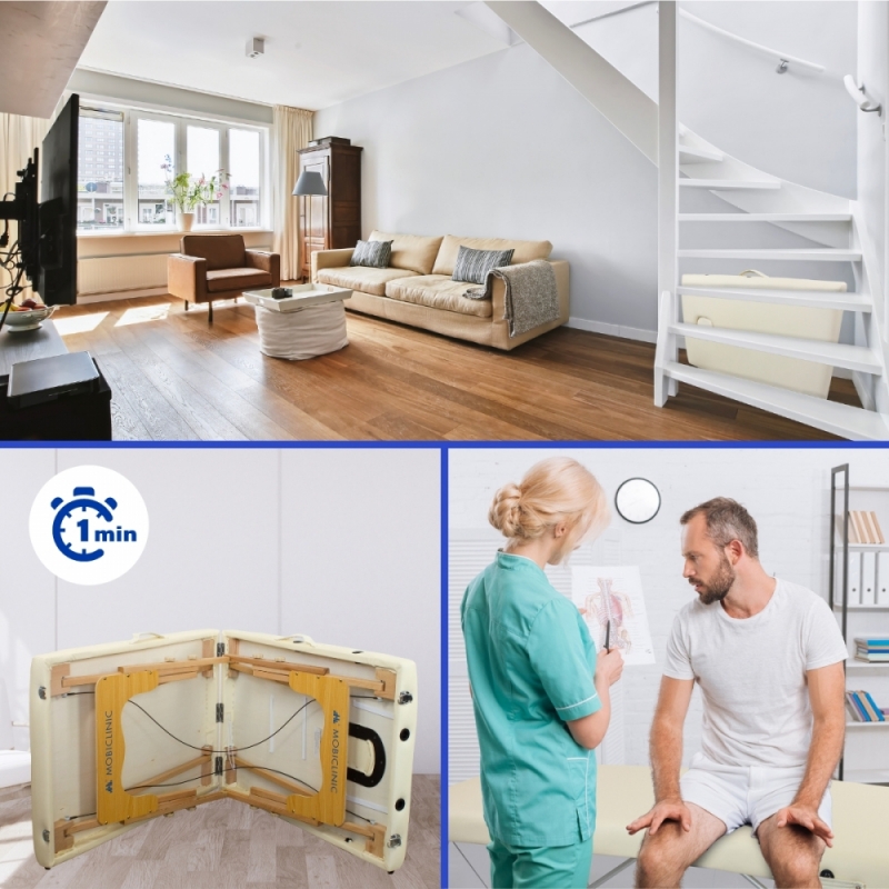 Es plegable, lo que permite que pueda ser usado también por profesionales que trabajan a domicilio. Además, para abrir y plegar cuenta con un sistema de bloque automático.