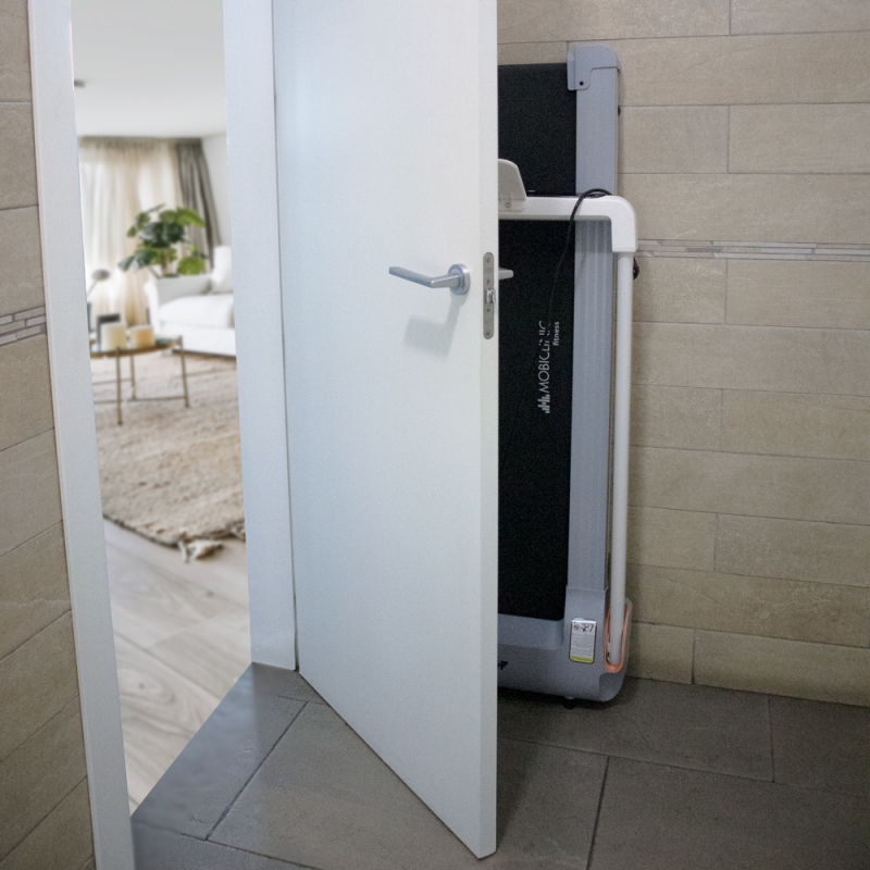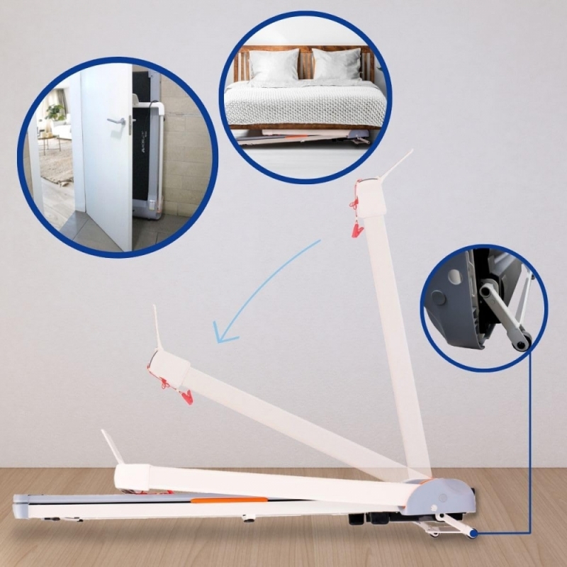 Almacenar y transportar esta cinta de andar plegable es muy sencillo pues gracias a sus dimensiones reducidas y al ser plegable y contar con ruedas se puede guardar en cualquier lugar que se desee como debajo de la cama, el sofá, etc. o transpórtalo donde se quiera realizar el ejercicio. Lo único que se debe tener en cuenta a la hora de guardar el equipo es que sea en un lugar cerrado, alejado del polvo y la humedad. Además, el soporte de dispositivos se puede quitar fácilmente con un destornillador en el caso de impedir el almacenamiento.