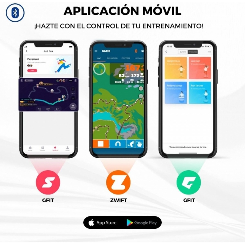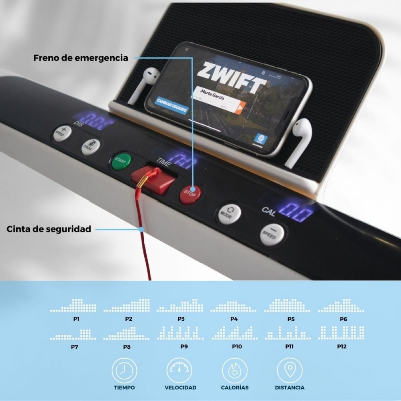 CON APP DE ENTRENAMIENTO: la cinta de correr eléctrica Tibet se puede vincular a aplicaciones como Gfit, Zwift y SPAX que permiten al usuario llevar el seguimiento del ejercicio de una forma más dinámica y entretenida. Con estas aplicaciones la combinación de diversión y el entrenamiento te ayudarán a cumplir tus objetivos junto a una comunidad que te motiva cada minuto. La aplicación Zwift está disponibles en los idiomas inglés, francés, italiano, alemán, español, chino y japonés, mientras que las otras dos solamente están disponibles en inglés. Igualmente, la cinta de correr se puede utilizar sin la app propuesta pues dispone de una barra led con 12 programas de entrenamiento.