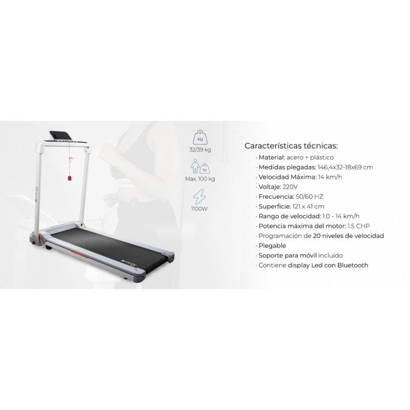 PISADA MÁS CÓMODA: gracias a la amplia longitud de su superficie de 121 x 41 cm, contarás con una cómoda pisada tanto para andar como para correr, pudiendo incrementar la velocidad de 0 a 14km/h.