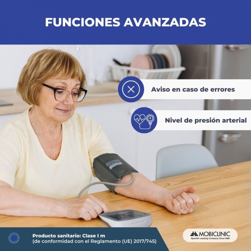 Cuenta con funciones de detección de arritmias cardíacas e indicador de riesgo, aviso en caso de errores y nivel de presión arterial.