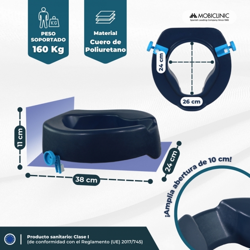 CONFORT Y DESCANSO: la forma del elevador inodoro reduce la presión y aporta un mayor confort gracias a su material blando de cuero de Poliuretano que se adapta al usuario.