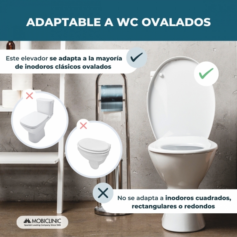 ¿A QUÉ INODOROS SE ADAPTA? Este elevador wc se adapta a la mayoría de los inodoros clásicos ovalados. Tenga en cuenta que no se adapta a los inodoros rectangulares o cuadrados. Para saber si este alzador wc se adapta a su inodoro, puede comprobar las medidas indicadas en la descripción.