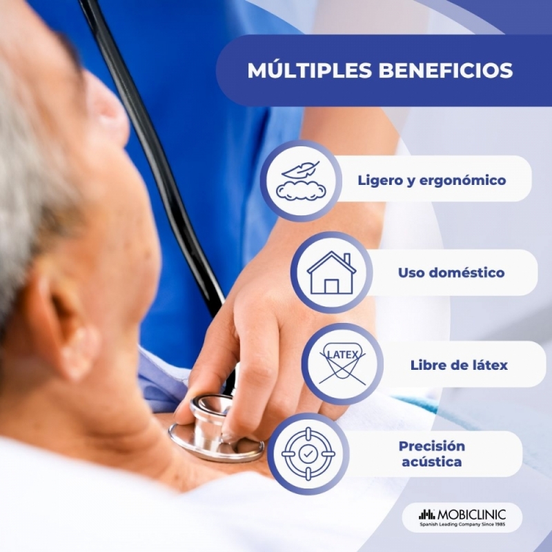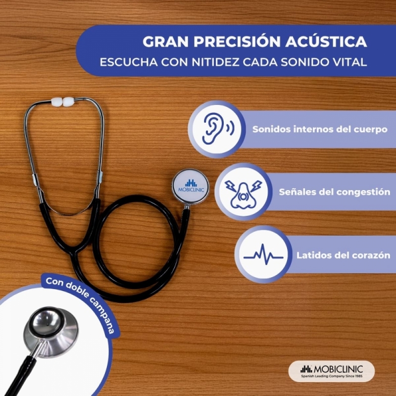 Se trata de un fonendoscopio negro de doble campana fabricado en aluminio y que se caracteriza especialmente por ser ligero, fácil de transportar y muy económico. Además, el producto está libre de látex. Este modelo de estetoscopio ofrece unas prestaciones imprescindibles para el buen hacer del profesional sanitario, como son unas propiedades acústicas realmente precisas para el diagnóstico más fiable.