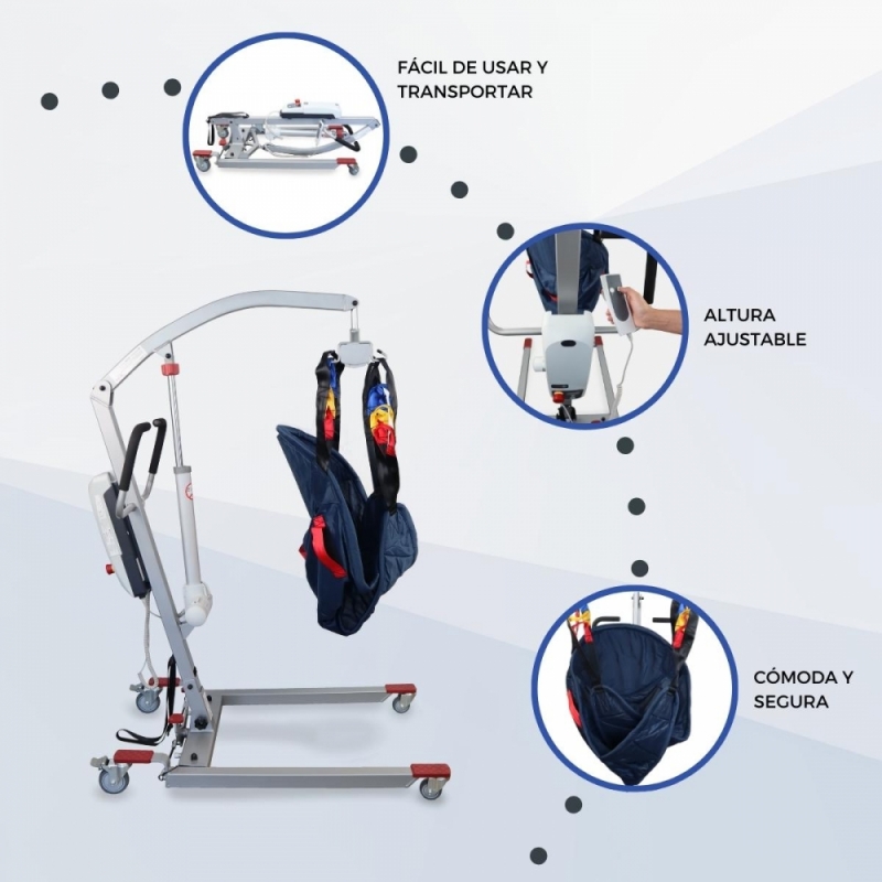 SEGURIDAD: Disminuye el riesgo de lesiones o caídas tanto del paciente como del cuidador. Dispone de una percha que permite que el paciente se pueda sujetar durante los traslados para garantizar estabilidad y a su vez, contiene un botón de parada de emergencia pudiendo bajar o subir al paciente manualmente si fuera necesario.