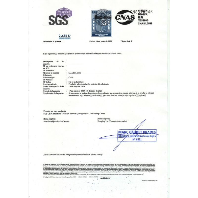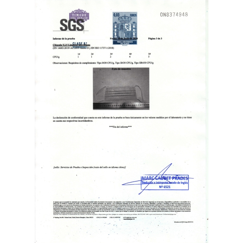 La mascarilla desechable quirúrgicaes tipo IIR tiene una eficacia de filtración bacteriana superior al 98%. Fabricadas conforme a Directiva 93/42/CEE relativa a productos sanitarios siguiendo norma EN 14683:2019+AC:2019. Test Report homologado por SGS y marcado CE.
