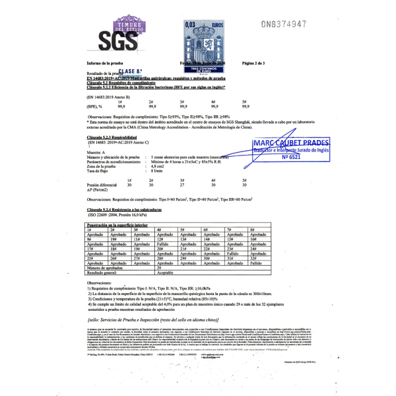 Todas las muestras ensayadas pos SGS muestran un porcentaje de filtración mayor al 99,8%.