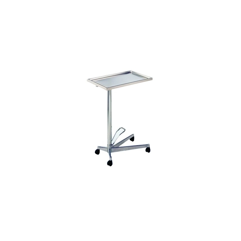 El material con el que se fabrica la mesa mayo es acero inoxidable AISI 304, y cuenta con una superficie plana y una pata con ruedas para poder desplazarla con facilidad según sea conveniente.
