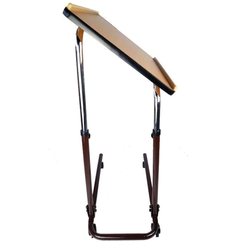 El ángulo de inclinación de esta mesa auxiliar es regulable al igual que la altura. Dispone de cuatro ruedas para la mayor comodidad de la persona que la use.