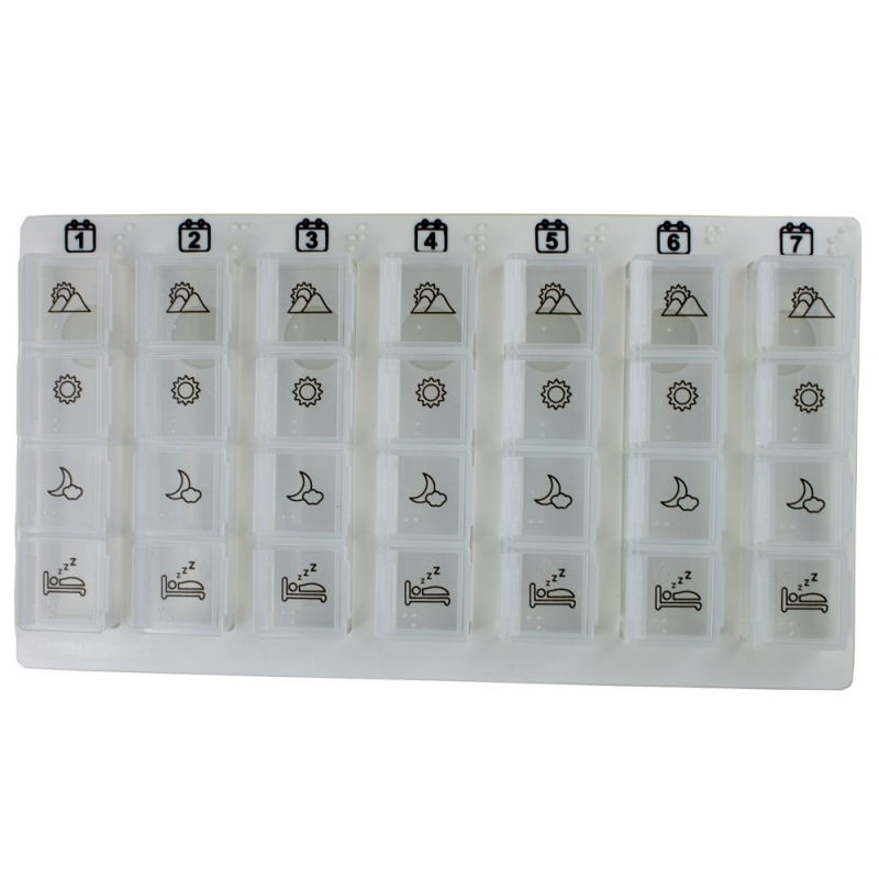 Cada recipiente tiene cuatro divisiones con el icono de cada momento del día, también representado en braille. Corresponden a desayuno, almuerzo, cena y hora de acostarse pero se pueden adaptar a las necesidades de cada paciente. Cada uno de los siete recipientes de este pastillero semanal se puede transportar cómodamente de forma individual para llevar solamente las pastillas de un día.