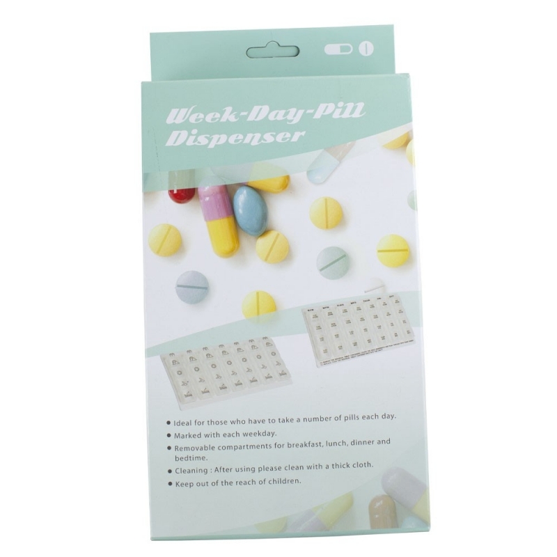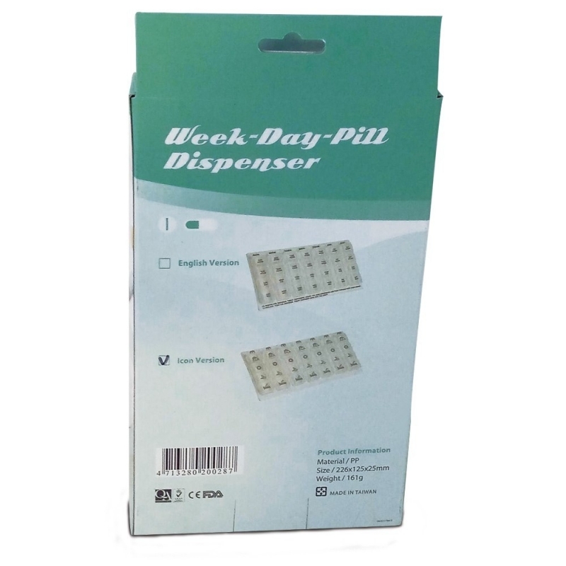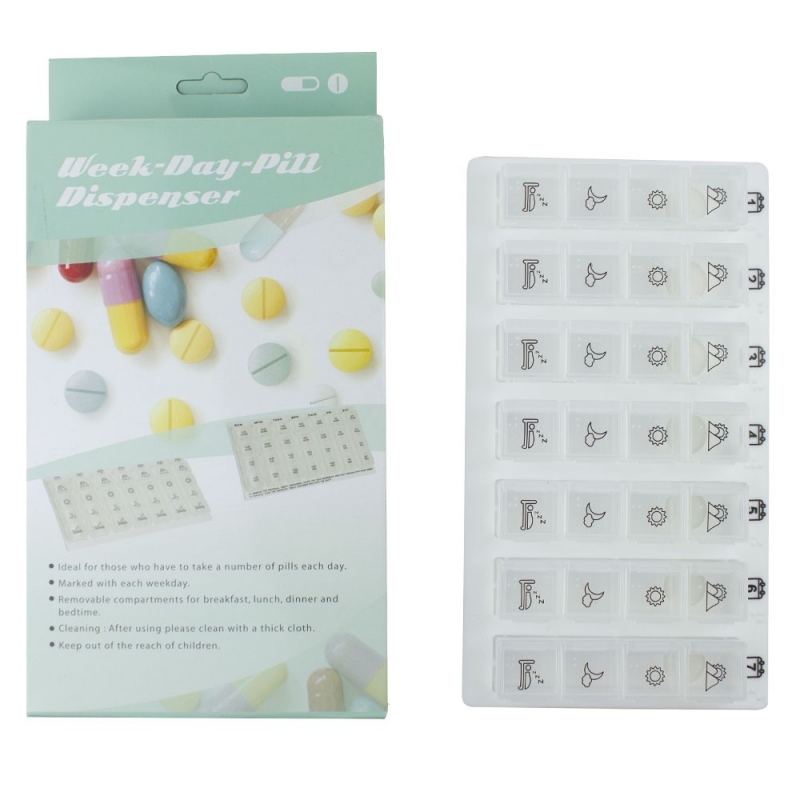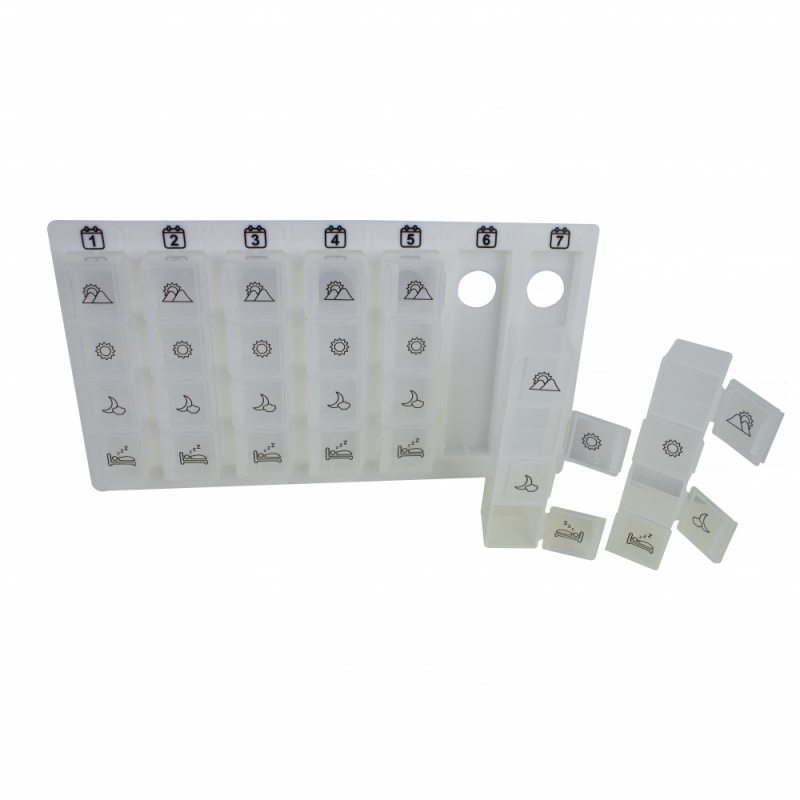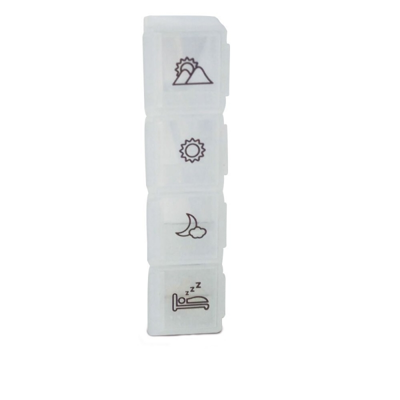 Este práctico pastillero semanal de 4 tomas contiene siete recipientes, uno para cada día de la semana. Es ideal para personas que tienen que tomar varias pastillas al día y para llevar el control. ¡No volverás a olvidar una toma gracias a este pastillero diario!