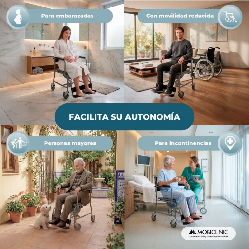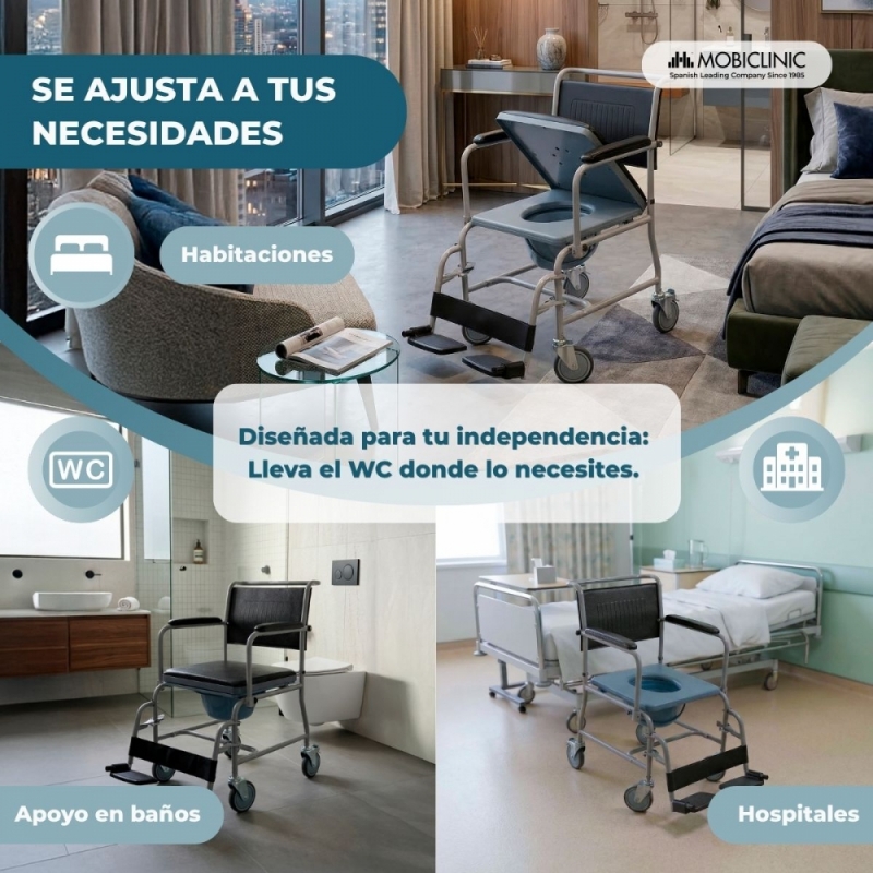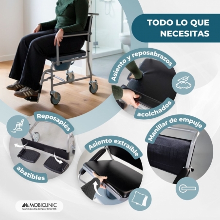 AJUSTABLE: esta silla inodoro cuenta con reposapiés y reposabrazos abatibles y extraíbles.