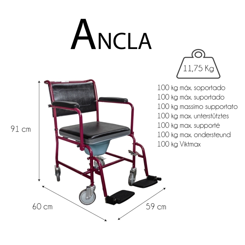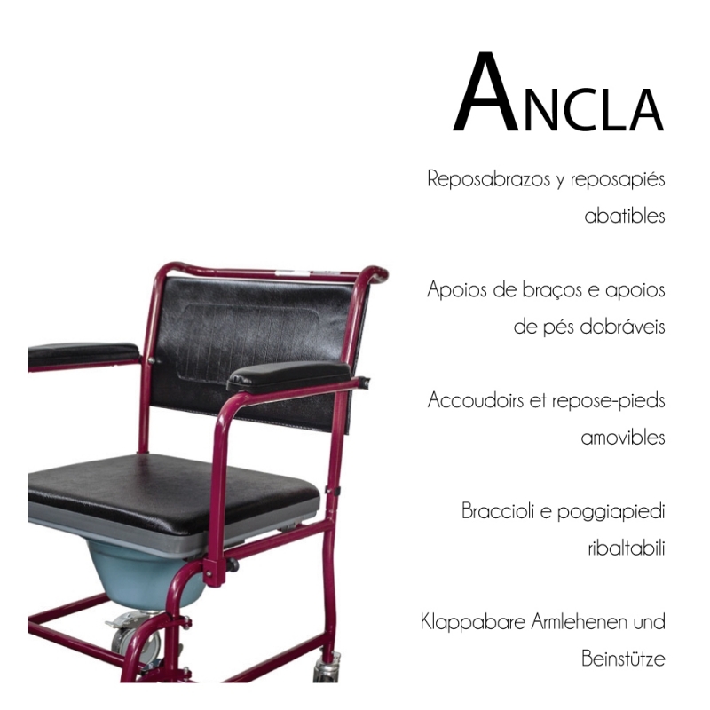 La silla de ruedas con inodoro Ancla se trata de una ayuda para el baño ideal para personas con movilidad reducida o con dificultades para asearse o realizar sus necesidades. Esta silla de baño es realmente manejable siendo muy cómoda para desplazar por el hogar.