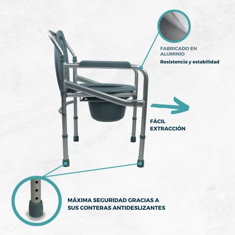 LIGERA: fabricada en aluminio con acabados en gris y blanco, esta silla orinal tiene un peso de 4,5 kilos, por lo que puedes desplazarla fácilmente.