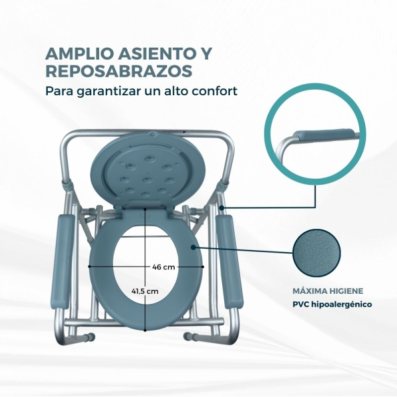 CONFORT: el asiento de esta silla wc le otorga comodidad al usuario y su respaldo/tapa le permitirá una relajación y descanso absoluto . La silla inodoro cuenta con reposabrazos acolchados para mayor confort.